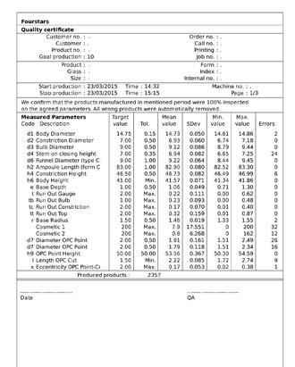 我們的安瓶機(jī)還備有在線攝像的尺寸和外觀檢測(cè)系統(tǒng),可同時(shí)檢測(cè)到安瓶的所有缺陷,對(duì)安瓶百分百檢測(cè),通過檢測(cè)的安瓶保證百分之百是合格的,該生產(chǎn)線還裝有生產(chǎn)信息的記錄系統(tǒng),自動(dòng)生成產(chǎn)品的檢驗(yàn)報(bào)告